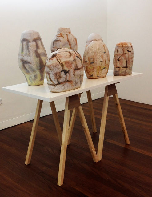 "This is a conversation - between the tension of use and placement, singularity and cluster. Interestingly, Kate Dorrough identifies creating conversation as a component of her inquiry. She says she seeks to enable a conversation between the tensions of 'paint and clay'. It is this push-pull between the gestural painterly mark, and the pinched and beaten archetypal form, where the conversation begins." Susan Ostling