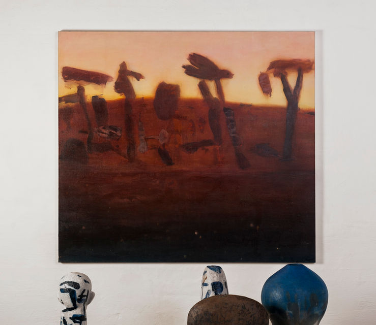 The layering of acrylic paint combined with the texture and weave of the linen's surface gives a density and depth mirrored in the materiality and tactility of the ceramics.
