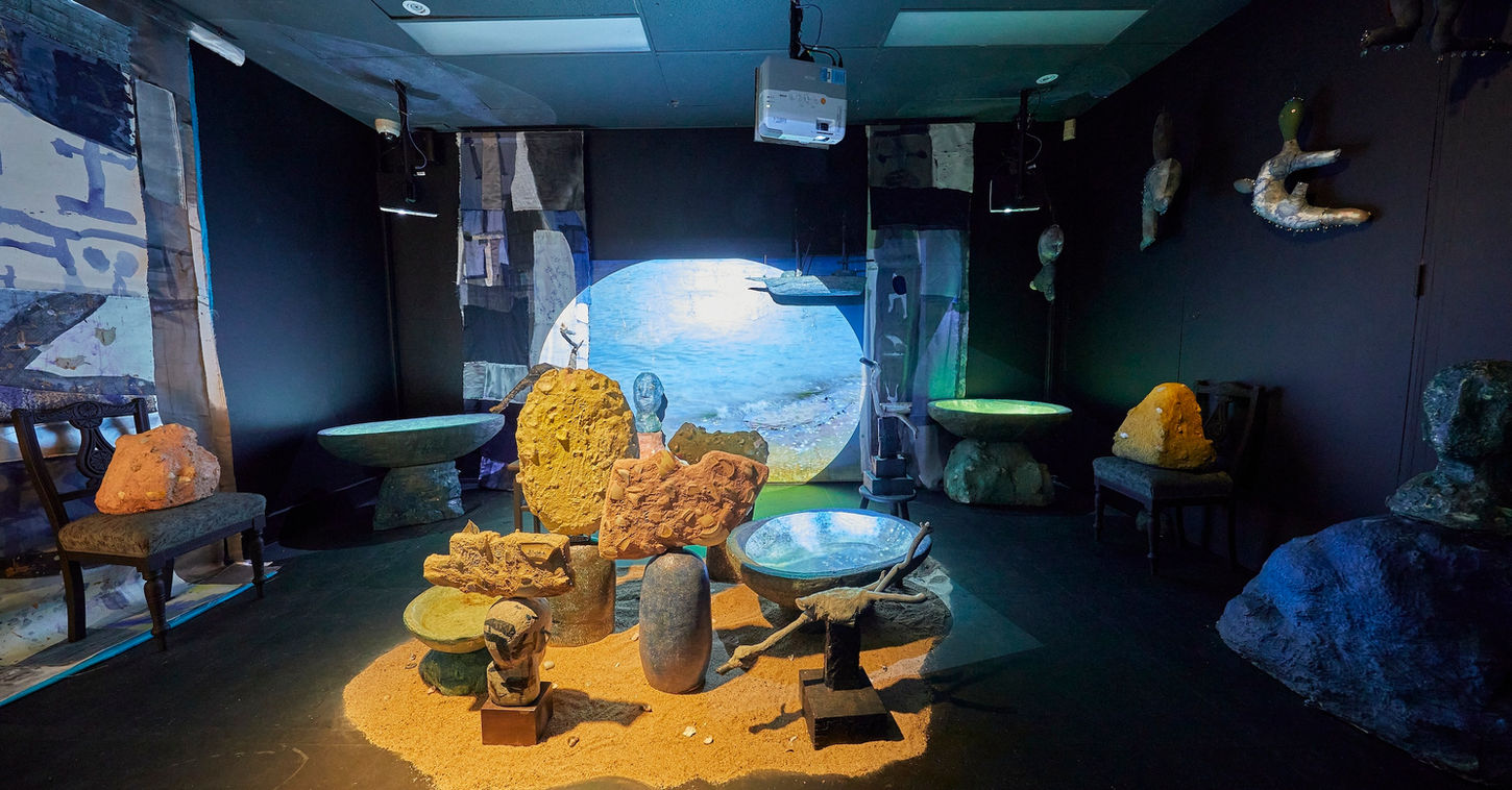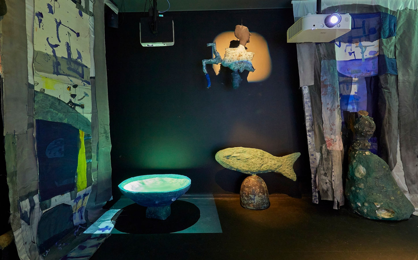The work consists of a range of materials; concrete structures and sculptural efBigies embedded with ceramic shards and shells, stoneware ceramic vessels, paint, video, sound, and fabric hangings. The layering of materials echoes a layering of historical references which reveal signs, totems and unearthed mysterious relics.