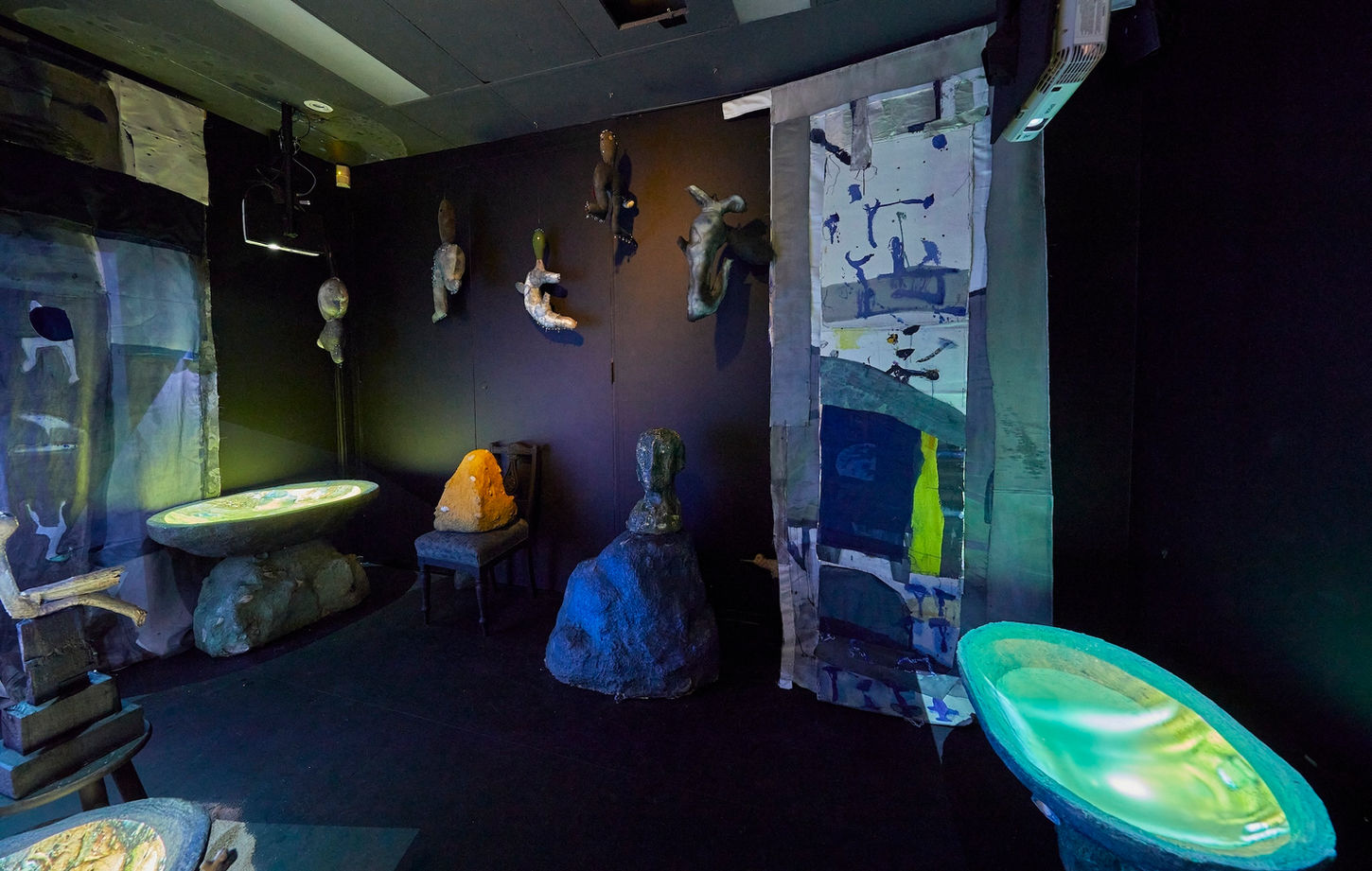 ‘Theatre of the Grotto’ continues on from this series with a mixed media immersive approach to the environment. As one’s eyes adjust to the darkness from the glare outside, primal forms start to emerge within this strange fantastical space. Blending sculpture, painted wall hangings, video and soundscapes, Dorrough draws the viewer into a mystical world, where things are not what they seem. Rocks turn out to be created from concrete, pools of water have videos playing on their surfaces and eerie soundscapes of trickling water and voices reciting classical poetry and text, drift in and out of the space. It’s hard for the viewer to determine what materials are real and what has been fabricated and recreated. Sculptures of water sprites are embellished with shells and ceramic shards, carved timber birds sit on man-made plinths and long fabric hangings decorated with lyrical calligraphic motifs float ethereally in the room. The hangings also act like stage curtains, enhancing the theatricality of the space.