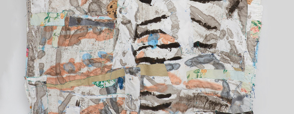 "The reuse of fabric from the home with a painterly application of acrylic paint, marks and stains infer a landscape still affected by recent bush fires, with its regenerative signs of regrowth. This bush landscape in its wildness backs onto a constructed suburbia, affected by introduced weeds and species proliferating after the fires. The lands topography is both arial and a stratified mountain face, its ridges suggesting a skeleton framework.